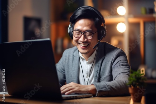 Asian businessman talking with team of colleagues in video conference Write a note in a book with a smiling face. Man using laptop computer and headphones for online meeting