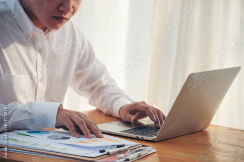 Asian Businessman type keyboard write financial graph chart Planning marketing data. Man hands using laptop at office desk reading spreadsheet excel finance document. Business men working home office