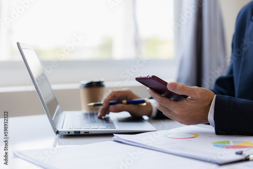 Asian businessman working at office with laptop, tablet and graph data sheet on his desk.