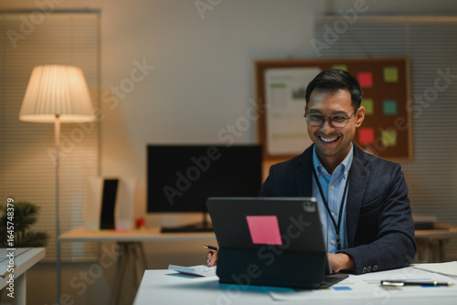 businessman, office, working, late, night, tablet, computer, calculating machine, business, work, job, technology, cyberspace, online, connection, communication, digital, device, screen, keyboard, typing, desk, table, chair, lamp, light, dark, interior, modern, corporate, professional, executive, manager, employee, men at work, person, man, asian, male, adult, smiling, happy, cheerful, confident, successful, achievement, career