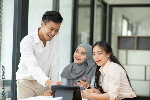 Asian businessmen, women and men Talk about new projects, presents at home office.