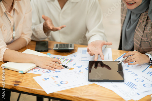 Asian businessmen, women and men Talk about new projects, presents at home office.