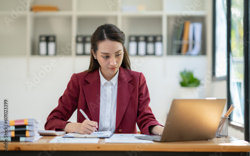 Asian businesswoman clicking details on laptop computer analyzing data checking accuracy of financial income happily in office management concept management.