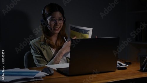 Asian businesswoman conferance meeting working hard at the night looking the laptop computer technology in workplace at late overtime, work at home.
