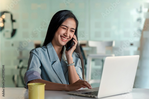 Asian businesswoman enjoy relaxation talking on the phone and using their laptop at the office.