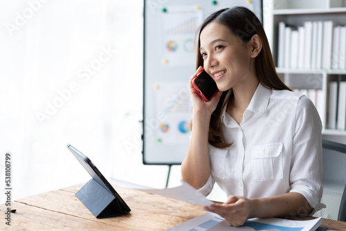 Asian businesswoman in formal suit in office happy and cheerful during using smartphone and working.