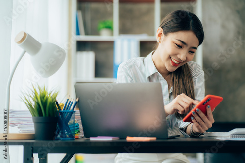 Asian businesswoman in formal suit in office happy and cheerful during using smartphone and working