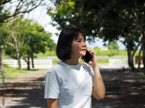 Asian businesswoman in white shirt walking and talking on the phone in public outdoor