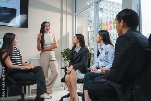 Asian businesswoman leading office meeting with teammates discussing charts on screen