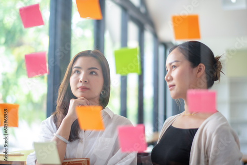 Asian businesswoman sharing opinions and analyzing notes on glass with colleagues in office. joy of working together