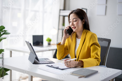 businesswoman, asian, business, office, phone, talking, analysing, chart, clipboard, datum, finance, work, working, professional, corporate, technology, laptop, desk, modern, bright, communication, strategy, analysis, planning, success, confident, determined, sharpened, concentration, multitask, entrepreneur, executive, management, leadership, sale, marketing, growth, development, investment, startup, small, 1, person, adult, indoor, daytime, copy, space