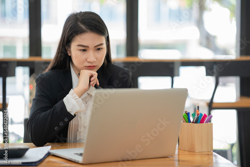 Asian businesswoman thinking, seriously and working with a laptop on the wooden table in the cafe.