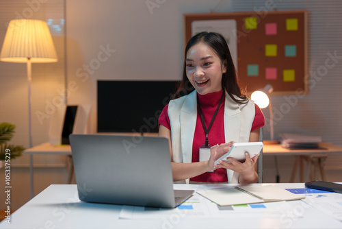 Asian businesswoman uses computer in office with documents Calculate work contacts Planning and analyzing financial reports business plan investment analytical concept business success.