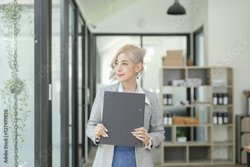 Asian businesswoman using calculator and financial documents at the table office, business financial concept.