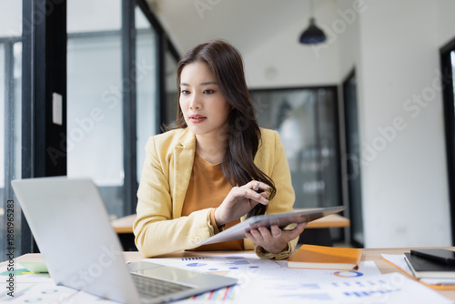 Asian businesswoman using digital tablet and laptop computer with business analyzing financial charts in the modern office.