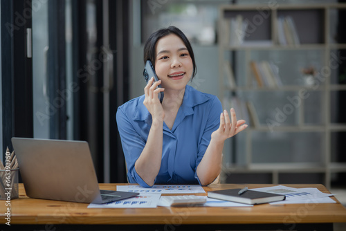 Asian businesswoman using smartphone sitting at desk in office, working online,
