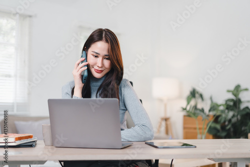 asian, businesswoman, laptop, phone, office, modern, professional, working, desk, technology, communication, sharpened, productivity, workplace, interior, plant, window, natural, light, casual attire, confident, multitask, remote, work, business, career, corporate, tablet, hot drink, cup, book, smiling, female, entrepreneur, job