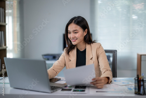 Asian businesswoman working with laptop and documents at office desk