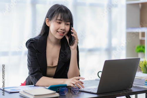 Asian businesswoman working with laptop and using mobile smartphone to communicate with colleagues and customers. Execute and coordinate using modern technology in the financial concept office.