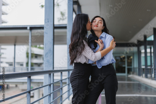 woman, businesswoman, asian, kiss, hugs, hug, love, affection, tenderness, human relationships, lesbian, homosexual, diversity, inclusion, equality, pride, office, work, career, professional, success, achievement, celebration, happiness, joy, emotion, expression, connection, bonding, support, friendship, colleague, partner, balcony, railing, architecture, building, modern, urban, city, outdoors, daytime, natural, light, lifestyle, real