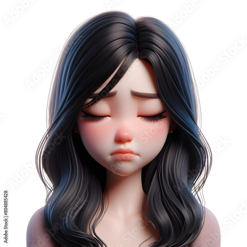 Asian cartoon character girl, young women portrait, female, sad mood, feeling expression concept, eyes close, 3d style, isolated on a white background