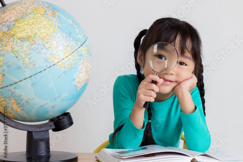 asian child rest her chin on her hand and look through a magnifying glass near a globe model