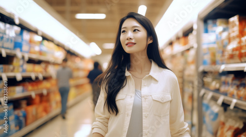 Asian Chinese woman shopping by the shelves of the grocery store
