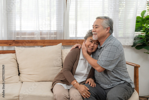 Asian couple elderly embracing together while sitting on cozy sofa at home. Happy senior retirement hug in love.