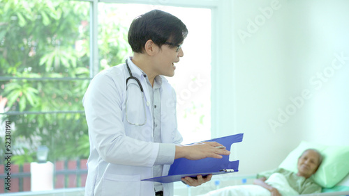 Asian doctor reading a medical document on notepad in hospital treatment ward.