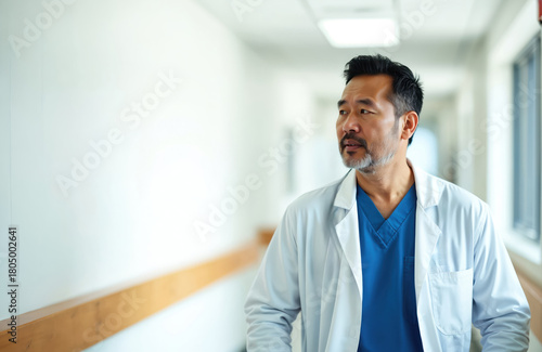 Asian doctor walks hospital hallway. Man wears blue scrubs, white coat. Healthcare worker looks away in thought near window. Professional contemplates medical solutions in clinic. Doctor checks