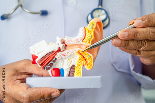 Asian doctor with ear human model to learn and treat hearing loss in patient.