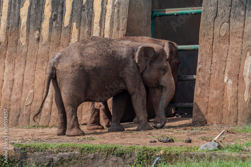 Asian elephant stands quietly inside zoo enclosure, captured in daylight with natural details on skin and habitat.