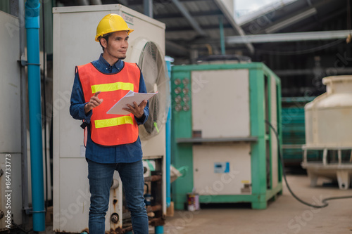 Asian engineer diligently inspects machinery in an industrial factory.Asian workers diligently inspect machinery with focused determination in industrial factories.