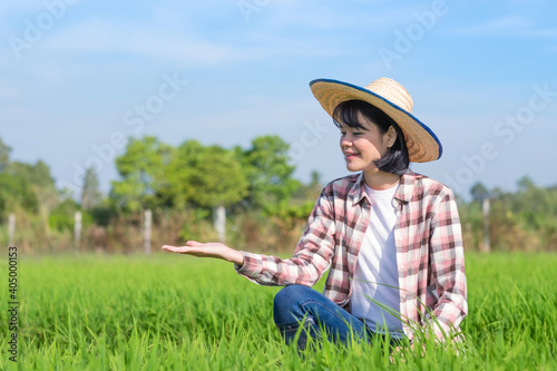 asian farmer woman sitting and raise hand for present products at green rice farm