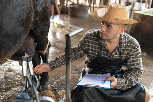 Asian farmer Work in a rural dairy farm outside the city,Young people with cow