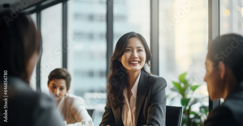 Asian female CEO with long hairs confidently leading a diverse boardroom meeting in office, symbolizing the increasing presence of women in top executive positions, copy space on right