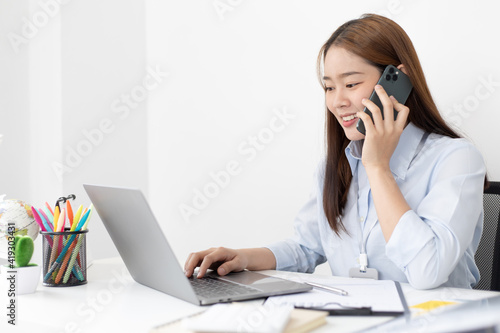 Asian female employee talking on the phone and working in a laptop with a smiling face, Office staff work and telephone conversations, Business conversation over the phone.