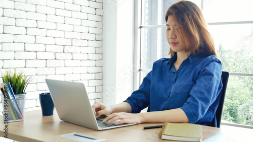 Asian Female freelance using laptop at home office desk. Woman reading financial graph chart Planning analyzing marketing data. Asian female people working office firm with business stuff, coffee cup