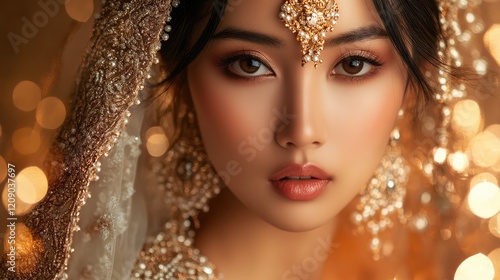 asian, woman, model, portrait, bridal, fashion, intricate, adornment, gem, sparkle, bokeh, background, warm, gold, beige, hue, closeup, shot, beauty, elegance, style, grace, femininity, attire, radiant, aglow, sheen, delicate, refined, artful, stunning, glamourous, exquisite, soft, vibrant, charming, alluring, customized, sophisticated, ornate, divine, precious, tasteful, dazzling, cultural, harmony, opulent