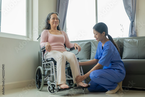 Asian female physiotherapist helping elderly woman stretch hamstrings and doing thigh or leg rehabilitation in gym medical health concept