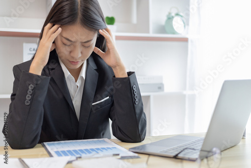 Asian female staffers are disappointed by the mistakes made, Despair or disappointment, Sad feeling, Suffering, Desperate, Hopeless, Fail, disastrous, bankrupt, Scared, panicky, Failure of life.