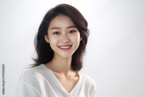 Asian female, wearing a white t-shirt, beams with delight, proudly displaying her smile in a studio environment against a neutral white background. Generative AI.