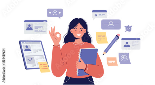 Asian female young adult holding notebook with digital networking elements illustration vector illustration