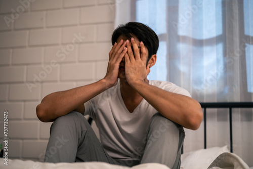 Asian frustrated insomnia man in pajamas sit on bed in dark night time.
