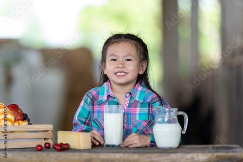 Asian girl drinking Fresh cow's milk that is produced from modern farms and dairy products. , product concepts from dairy farms and health