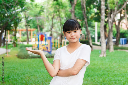 Asian girl showing blank space.