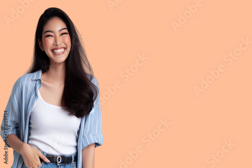 Asian girl standing and laughing happily background