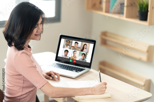 Asian girl using computer laptop for remote meeting conference program. Woman writing some short note after internet online discuss with office team colleague at home. Prevent for covid19 outbreak.