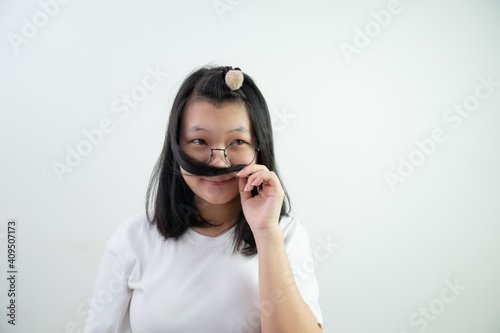 Asian glasses young woman is Thinking something and smelling her hair on on white background.