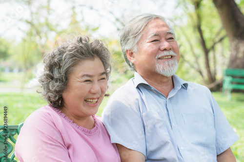 Asian healthy senior couple relaxing seated in the park together.
